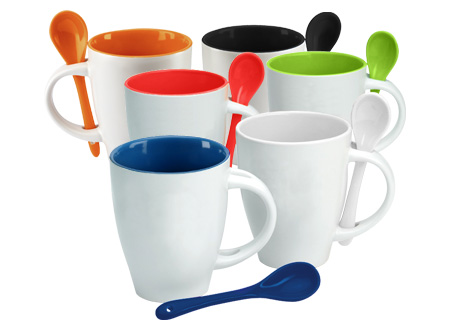 Tazon Ceramico Blanco opaco con interior y cuchara de color. Presentacion en caja de carton blanco.